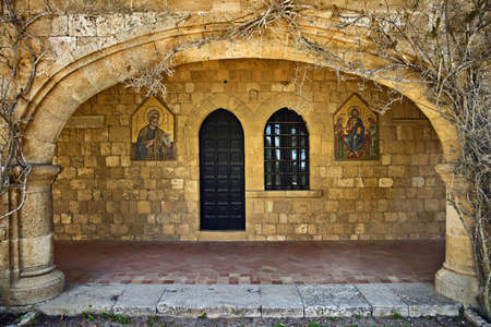 Column corridor with icons of Saints in Monastery of Filerimos on Acropolis of Ialyssos (Rhodes, Greece)