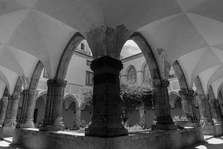 Chiavenna (Sondrio, Lombardy, Italy): cloister of the historic collegiata of San Lorenzo. Black and white