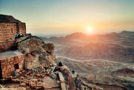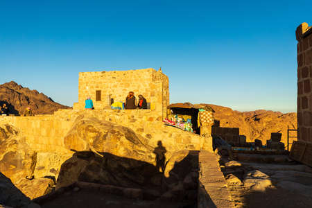 Church worship on greek orthodox chapel on Mount Sinai. Beautiful dawn in Egypt, early morning view of the top of the Mountain.