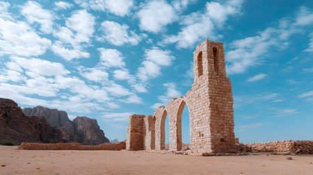 Captivating view of ancient stone ruins set against a vast desert landscape. The blue sky dotted with fluffy clouds creates a serene backdrop for exploration and history.