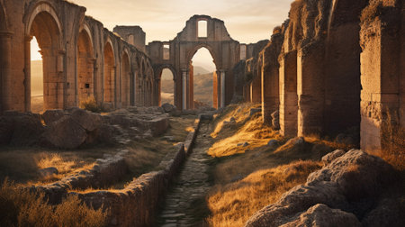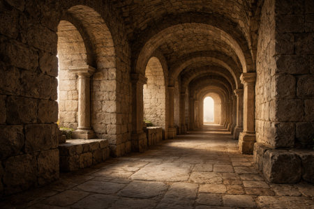 Stone arches create a pathway through an ancient corridor, filled with soft light and a sense of history during the early morning hours