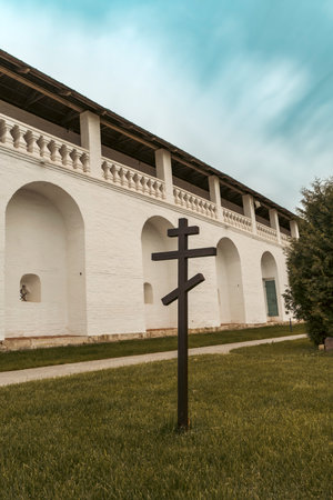 An Orthodox cross stands on a green lawn in front of a historic monastery building with white arches and balustrades, under a cloudy sky.