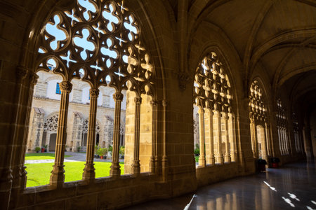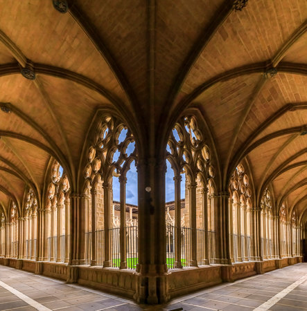 Pamplona, Spain - June 21 2021: Ornate gothic cloister arcade arches of the Catholic Catedral de Santa Maria la Real, 15th Century Gothic Cathedral