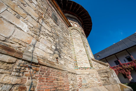 SUCEVITA, ROMANIA - AUGUST 17, 2014: Sucevita painted fortified Monastery in Romania unique by exterior mural frescos of great artistic value depicting biblical episodes from the Old and New Testament, unesco heritage