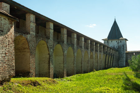 Ancient walls and watchtowers of the Kirillo-Belozersky Monastery (Russia). Clear, sunny summer day.