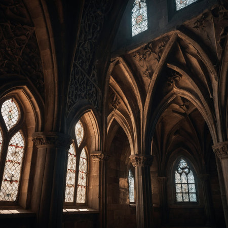 Enchanting sunbeams in gothic church hallway