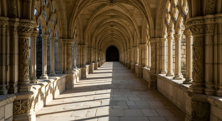 A long, vaulted cloister hallway in a historic monastery, characterized by Gothic arches and stone columns. Sunlight streams through the arches, casting long shadows on the stone floor, creating a serene, spiritual, and timeless atmosphere.