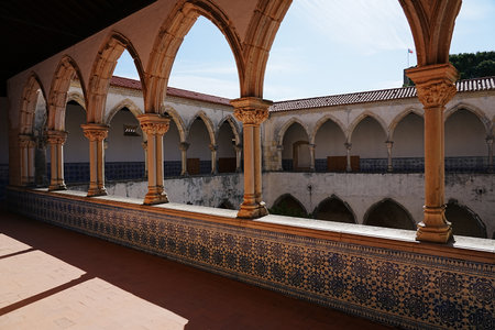 TOMAR, PORTUGAL - MAY 8th 2022: Cloisters in convent of Christ in European city at Santarem district, clear blue sky in warm sunny spring day.