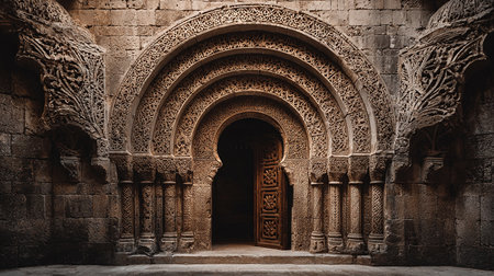Bright sunlight pours through an arched doorway in a weathered stone structure, creating a warm glow on the floor. The scene captures a moment of serenity, highlighting architectural beauty.