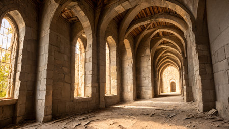 AI Generated. Historic Stone Archway Corridor with Natural Light