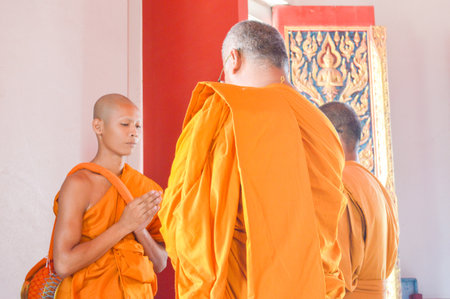 SAKONNAKHON,THAILAND December 23: Newly ordained Buddhist monk pray with priest procession. Newly ordained Buddhist monks have a ritual in the temple procession in December 23, 2012