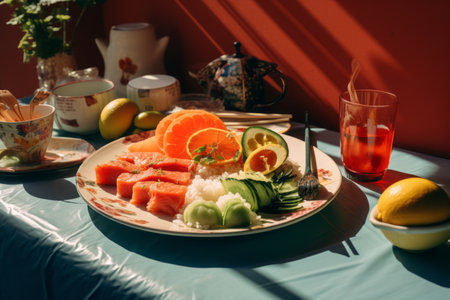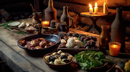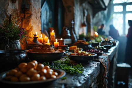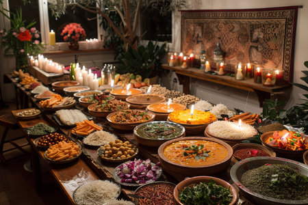 This vibrant image showcases a traditional Asian table setting, adorned with food, floral arrangements, and decorative items, reflecting cultural heritage.