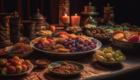 A beautifully arranged platter of colorful fruits including shiny red apples luscious oranges and ripe bananas p beside a steaming bowl of dumplings. Glimmering candles flicker on.