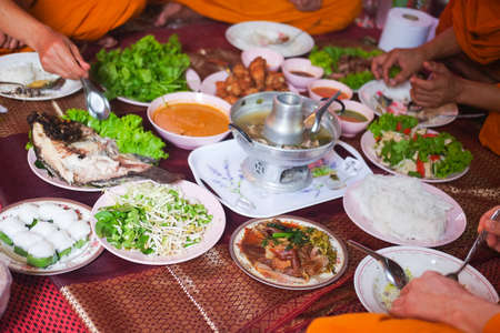 food and drink for monks in traditional religious ceremony in a temple in Thailand