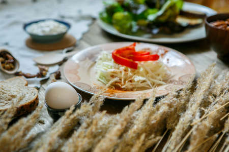 A traditional Vietnamese meal for lunar new year Tet holiday in spring, placed on new flowered sedge mat, on the last day of the last year