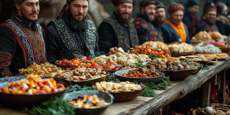 traditional Yakut food arranged on a wooden table during Ysyakh