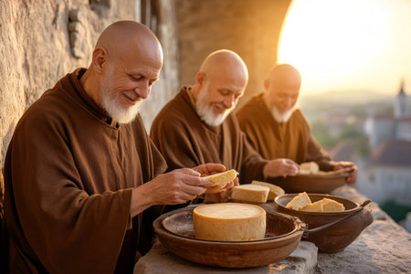 Group of monks wearing traditional brown robes cutting and tasting pieces of cheese in a monastery at sunset