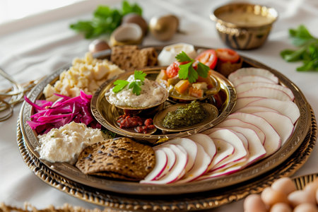 Traditional passover seder plate food arrangement roasted lamb shank parsley hard-boiled egg horseradish bitter herbs charoset for jewish holiday celebration.