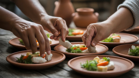 Multiple hands are carefully placing small food items onto rustic, brown clay plates. Each plate contains a few pieces of white food, possibly chicken or fish, garnished with fresh green herbs and slices of orange vegetables, likely carrots. The plates are arranged on a weathered wooden surface. In the background, two large, unglazed terracotta pots are visible. The lighting is soft, highlighting the textures of the food and hands.