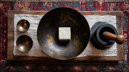 An intimate rustic kitchen scene featuring a wooden bowl, mortar, and herb ingredients set against decorative fabric, inviting culinary creativity.