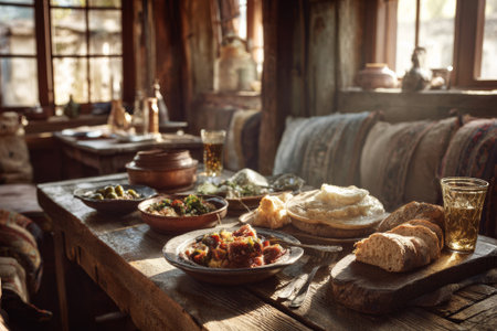 Warm sunlight illuminates a table laden with authentic Georgian cuisine, showcasing the rich culinary heritage of the region in a rustic restaurant setting