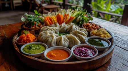 A vibrant arrangement of dumplings served with an assortment of colorful sauces and fresh vegetables, perfect for a delicious meal or appetizer display.