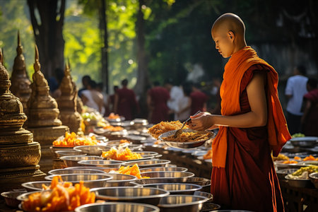 Alms giving ceremony with monks receiving food offerings against the backdrop of a temple setting.