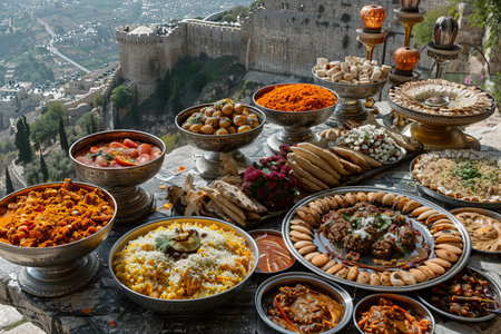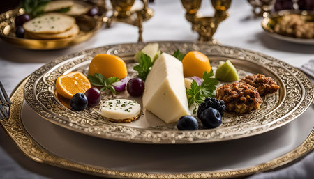 An overhead view of a beautifully arranged traditional Middle Eastern table setting, featuring a golden tray filled with a variety of delicious foods, including fruit, dates, cheese, and bread. The table is set with silverware and other decorative elements, creating a visually appealing and inviting atmosphere.