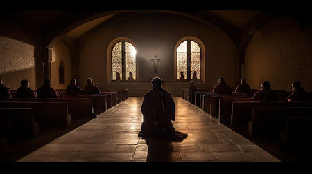 A captivating scene of monks engaged in deep meditation in a historic monastery, showcasing their shared spirituality and peaceful atmosphere.