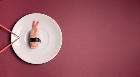 Vertical panorama of a sushi on a white plate with blue background and a large copy space on the right.