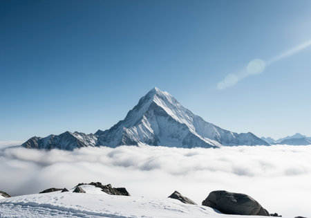 Snow capped mountain peak dramatically rising above a thick layer of white clouds cloud inversion under a clear, bright blue sky. foreground features snow and rocks.