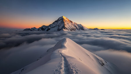 A majestic mountain peak is visible, partially covered in snow and lit by the soft glow of a sunrise. The image showcases a landscape with a layer of clouds, emphasizing the height and scale of the mountain. Suitable for travel, nature, or environmental related projects and editorials.