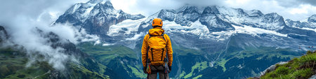 Hiker with a backpack on the top of a mountain in Switzerland