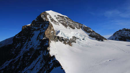 Great Aletsch glacier of Swiss and Bernese Alps and jungfrau snow mountain peak view from Jungfraujoch top of Europe with blue sky in summer background and copy space, Switzerland