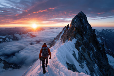 A mountaineer climbs a snowcovered ridge toward a spectacular sunrise