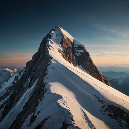 A breathtaking view of a snow-covered mountain peak at sunrise, with the sun peeking over the ridge, casting a warm glow on the snow and illuminating the stars in the sky.