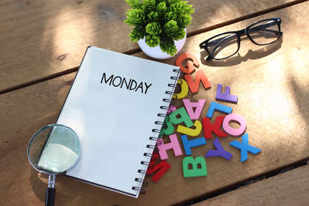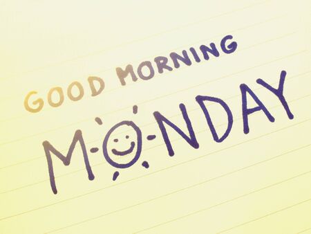Hand writing on notebook with good morning Monday and hand draw smile, colored filter effect