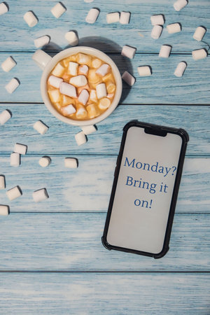 MONDAY BRING IT ON concept text on mobile phone screen with white cup of coffee and marshmallows on wooden background. Reminder of The most depressing day of the year in January. Day commit suicide and depression