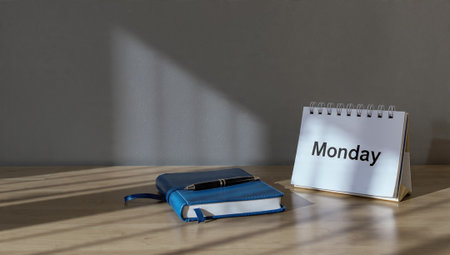 A blue journal, pen, and Monday calendar on a wooden desk in morning light
