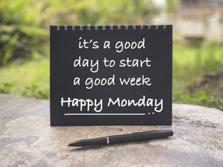 Motivational and inspirational wording. IT’S A GOOD DAY TO START A GOOD WEEK. HAPPY MONDAY written on a notepad. Blurred style background.