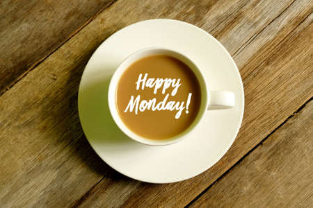 Top view of a cup of tea with words HAPPY MONDAY! on wooden background.Concept for blog title and header.