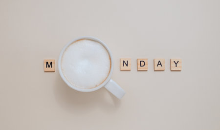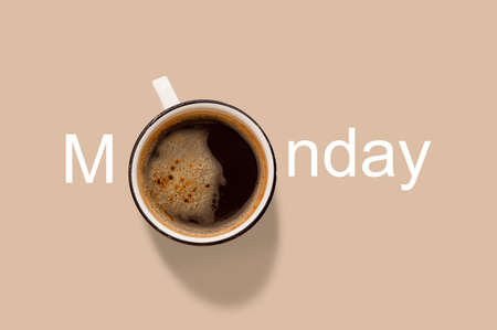 Monday inscription and cup of coffee on warm, neutral beige background. Motivational quote creative coffee, concept