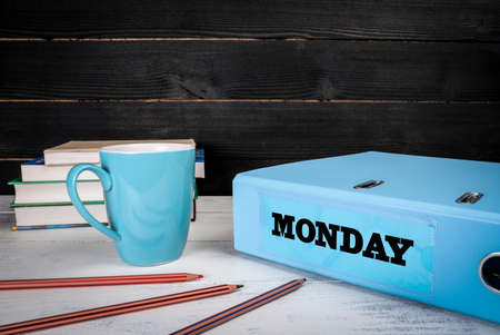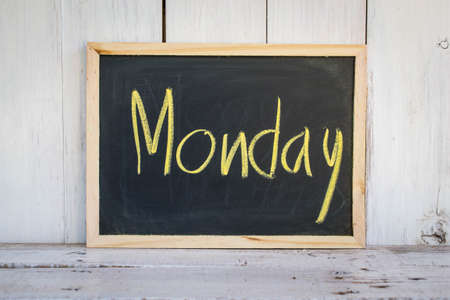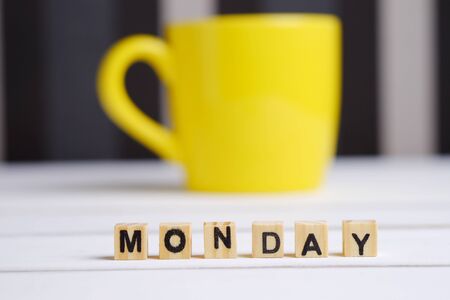 Close up of Monday in letter wooden block selective focus on white wood table background concept. Yellow cup decoration style.