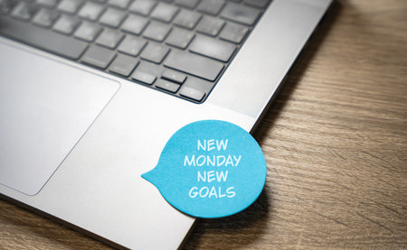 Inscription New monday new goals on a keyboard. Motivational phrase that reminds that Monday is a fresh start - a chance to set new goals and move forward.