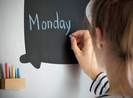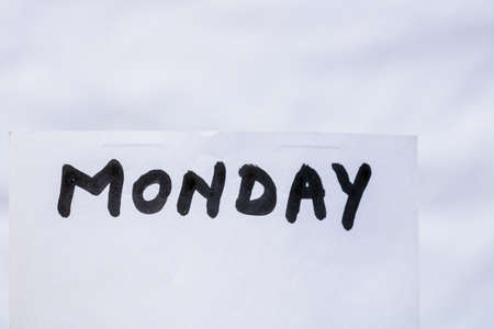 Monday handwriting text close up isolated on white paper with copy space. Writing text on memo post reminder