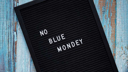 Blue monday day banner concept. Black board with text no blue monday on blue wooden background, top view, flat lay