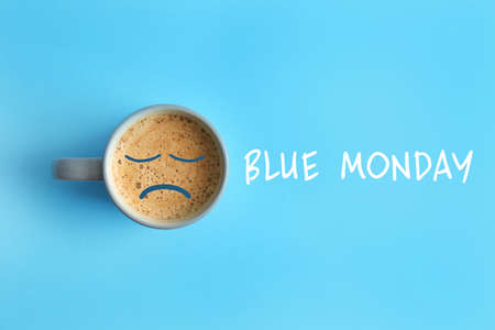 Cup of coffee and text Blue Monday on turquoise background, top view
