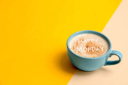 Happy Monday. Cup of aromatic coffee on color background, space for text