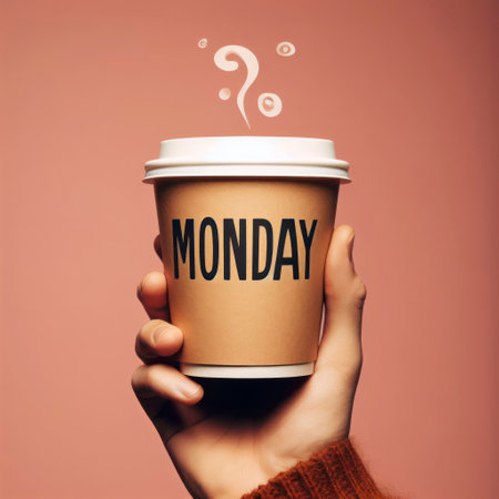 Close up coffee cup in hand with the word MONDAY on solid color background. ai generative.