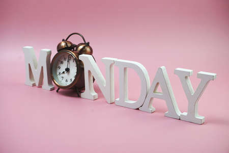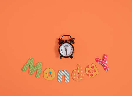Letters Monday and alarm clock on a coral orange background. Horizontal flat lay composition, new work week start concept